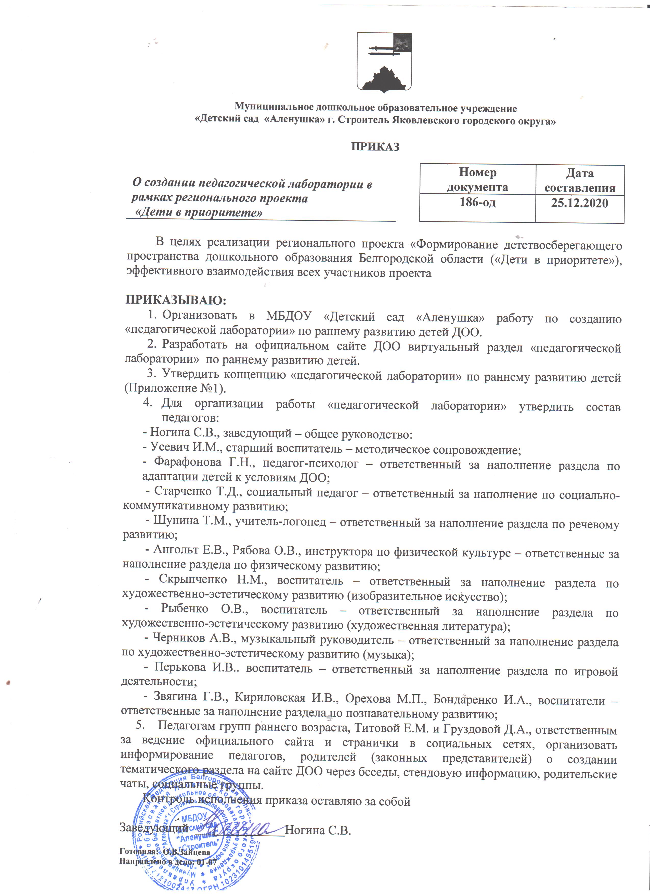 Приказ о создании педагогической лаборатории в рамках регионального проекта "Дети в приоритете" №186-од от 25.12.2020 года