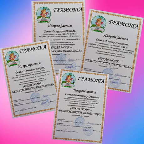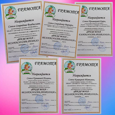 1 место - семья Свиридова Владислава (группа «Ромашка»), семья Свириденко Варвары (группа «Малыши-карандаши»), семья Кучминой Полины (группа «Радуга»), семья Кашковой Татьяны (группа «Сказка»), семья Примаковой Киры (группа «Ягодка»).