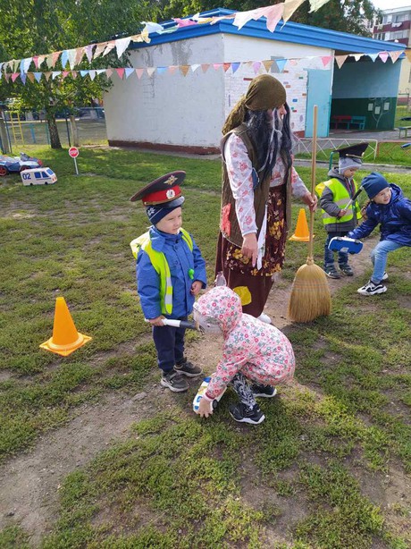 Вместе с Бабой Ягой в игровой форме дошкольники закрепили знания о правилах дорожного движения; в играх-эстафетах: «Передай жезл», «Автокресло», «Собери аптечку», «Инспектор ДПС», расширили свои представления о правилах поведения на улице.