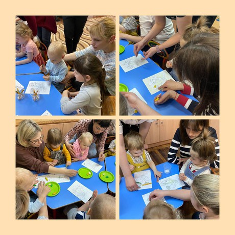 В ходе игрового сеанса малыши, вместе с Зайкой, познакомились с одуванчиком, узнали, что нельзя рвать цветочки, поэтому им было предложено нарисовать и сделать из пластилина Зайке и его друзьям этот красивый цветок. А ещё малыши на весенней полянке выполняли игровое упражнение и танец «Одуванчики», потанцевали с платочками и погремушками, поиграли с Зайкой («Зайка прыгал под кустом») и построили красивые домики.