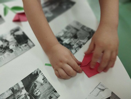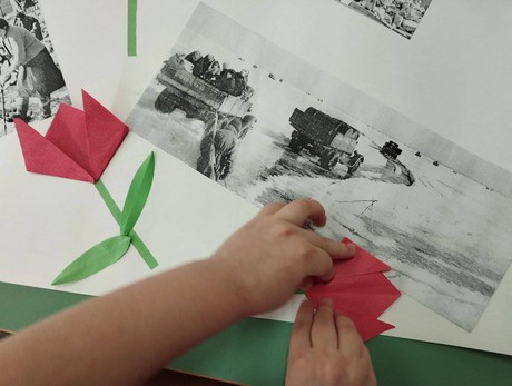 В память об этом дне, воспитанники изготовили способом оригами красные цветы, которые прикрепили к плакату «Ленинград. Блокада. Память». Именно они будут напоминанием всем нам о стойкости нашего народа в период блокады Ленинграда.