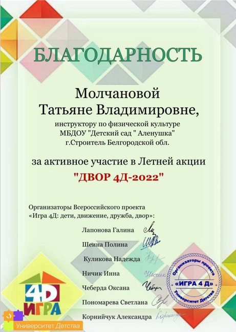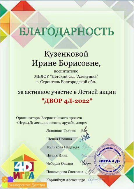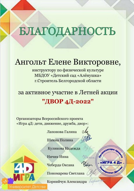 Каждому ребенку нужен мир, где можно смеяться, танцевать, петь, учиться, жить в мире и быть счастливым. А ещё каждому ребенку дошкольного возраста необходима ИГРА! Именно поэтому в летний период наши педагоги вместе с воспитанниками детского сада приняли активное участие в Летней Акции «ДВОР 4Д - 2022».