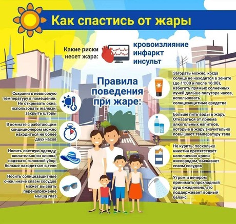 Во избежание ухудшения самочувствия, обезвоживания организма, рекомендуем меньше находиться на солнце. Если это неизбежно, надевайте головные уборы и пейте больше жидкости. По возможности ограничьте длительные поездки на автомобиле!