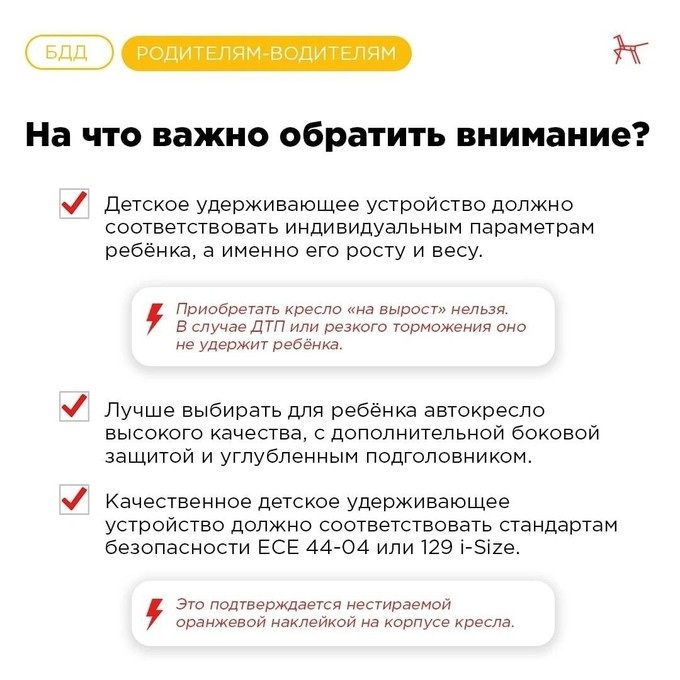 Подбирайте детское удерживающее устройство правильно, его использование убережёт ребёнка в случае опасности! А ещё важно помнить, что у ДУУ существует срок годности, а именно 5 лет с момента изготовления, поэтому важно не забыть поменять кресло в нужный момент.