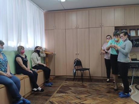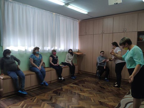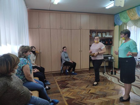 В ходе игрового тренинга, который провели педагоги Воронова И.В. и Груздова Д.А., мамы смогли познакомиться с играми, которые можно организовать в домашних условиях - "Угадай профессию", "Узнай профессию на ощупь", "Самая-самая", "Назови профессию, которая начинается на букву...".