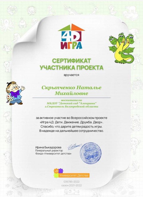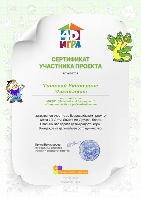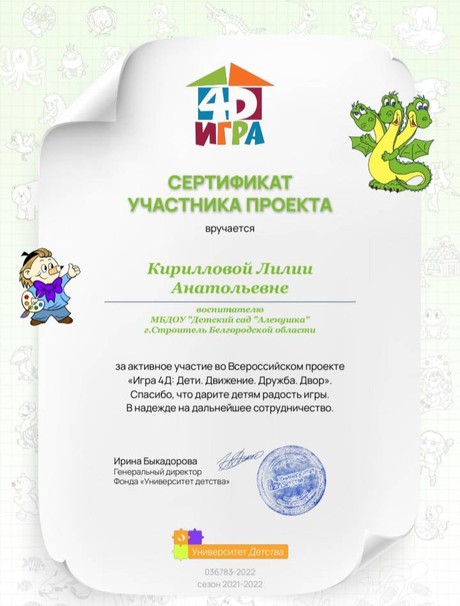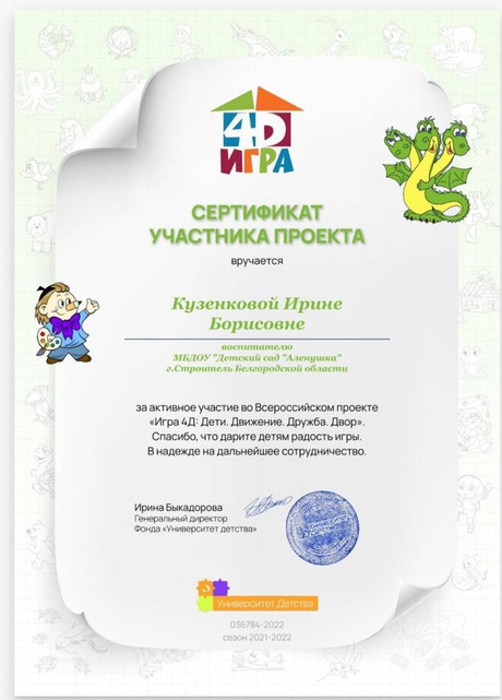 Наши самые активные педагоги - Ангольт Елена Викторовна, Дудина Елена Владимировна, Кириллова Лилия Анатольевна, Кузенкова Ирина Борисовна, Скрыпченко Наталья Михайловна, Титова Екатерина Михайловна, с сентября 2021 года по май 2022 года играли с воспитанниками в «Игру месяца» проекта «ИГРА 4D: Дети, Движение, Дружба, Двор», став участником большого сообщества единомышленников по возрождению детской игры!