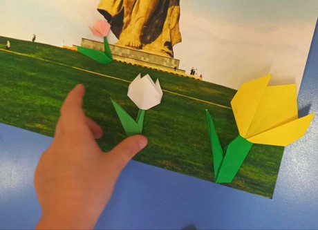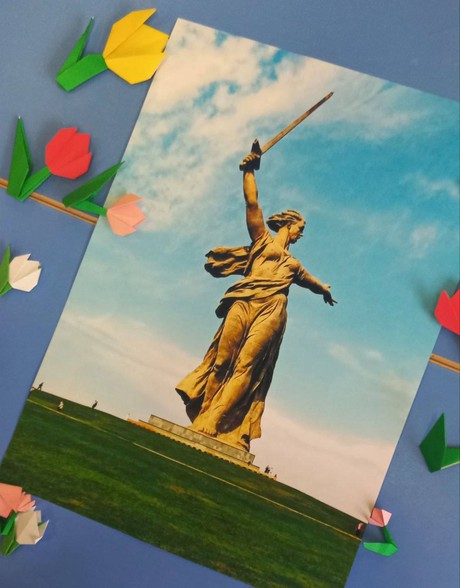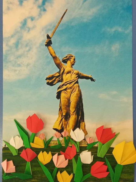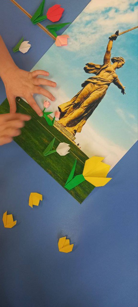 Интерес воспитанников привлекла выставка, где особое внимание было уделено 85-метровой скульптуре «Родина-мать зовет!», которая является главным образом Мамаева кургана. Именно этот монумент увековечил подвиг солдат и в знак благодарности советским воинам, ребята, используя технику работы с бумагой - оригами, сделали тюльпаны, которые и прикрепили на картину с изображением скульптуры!