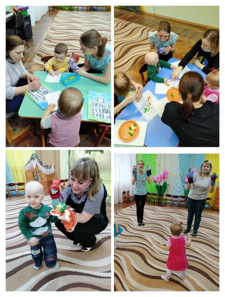 С увлечением малыши занимались продуктивной деятельностью: приклеивали каждого героя в домик, с помощью пластилинографии вырастили "Морковь для зайчика", участвовали в танцах-плясках "Танец с платочками" "Танец с ленточками", с большим удовольствием собирали пирамидки.