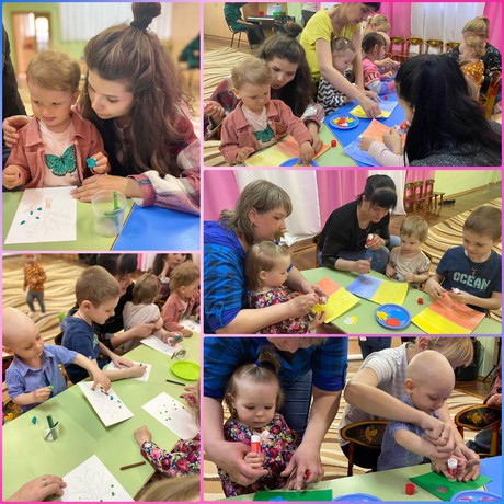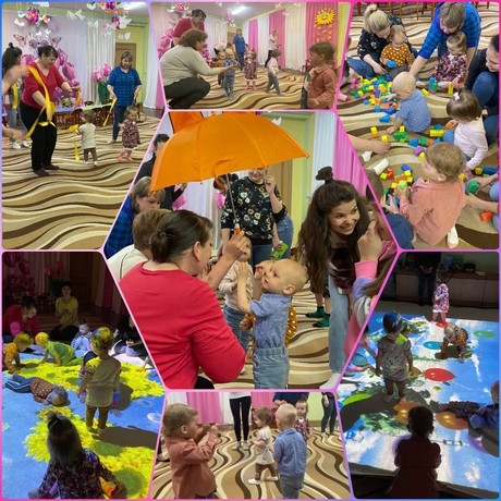 Разные виды деятельности способствовали привлечению к общению со взрослыми и сверстниками, формировали представление о величине, форме, цвете. Завершилась встреча игрой на интерактивном полу, который вызвал интерес у малышей и их родителей.
