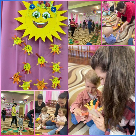 Сегодня в музыкальном зале состоялась очередная встреча с родителями и малышами, посещающими Консультационный центр «Центр игровой поддержки». Тема игрового сеанса «Весна-красна» оказалась актуальной, поэтому малыши радовались яркому весеннему солнышку, конструировали «из прищепок» лучики маленьким солнышкам, прятались под зонтиком от весеннего тёплого дождя, способом налепа делали листочки на деревья, слушали пение птиц, строили скворечники для птенцов, наклеивали первые весенние цветы на полянку.