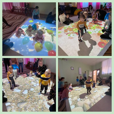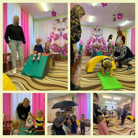 Педагогами Митрохиной О.М., Кузенковой И.Б., Сафроновой А.А. в ходе встречи были предложены разнообразные игры и танцы. В гости, к малышам и их мамам, приходили мишка, белочка и зайка. Ребята рисовали травку, клеили солнышко и дорисовывали лучи. С удовольствием собирали для зверюшек: грибы, каштаны, жёлуди и шишки, которые складывали в построенные домики из конструктора. Дети танцевали с платочками, погремушками и лентами, также делали угощение для белочки, зайчика и мишутки из кинетического песка.