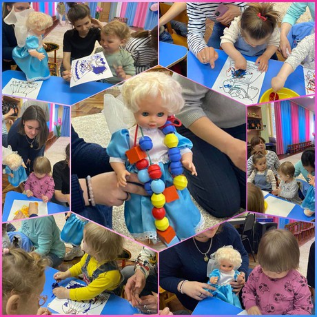 В гости пришли друзья куклы Кати: птичка и собачка с подарками и игрушками для малышей. С птичкой полетали, поклевали зёрнышки. С собачкой потанцевали с платочками, погремушками. Чтобы все согрелись малыши нарисовали солнышко, а затем поиграли в игру «Ты беги веселый мячик». При поддержке родителей маленькие гости приготовили для именинницы конфетки и украсили много платьев.
