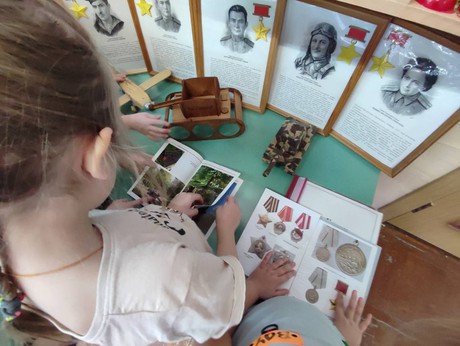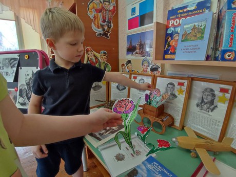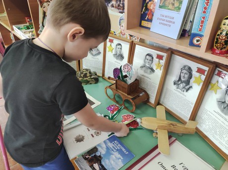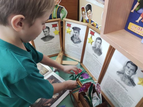 С целью формирования у дошкольников чувства патриотизма, гордости и уважения к воинам, защитникам Отечества и в рамках проведения муниципального Патриотического марафона «Живут Герои в памяти народа» для воспитанников группы «Дюймовочка» была организована тематическая выставка «Память, живущая в веках».