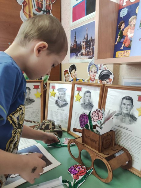 Рассматривая фотографии Героев Великой Отечественной войны, ребята познакомились с подвигами тех, кто проявил личное мужество, стойкость, готовность к самопожертвованию. Именно сильная любовь к Родине, беззаветная преданность Отечеству делает героев бессмертными!