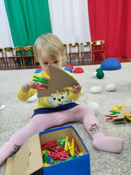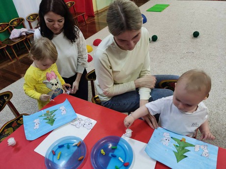 Игровой сеанс был сегодня достаточно насыщенным разнообразной детской деятельностью - малыши налепом делали ёлку, клеили около нее разных животных, украшали ёлочку разноцветными игрушками из пластилина, рисовали снег.